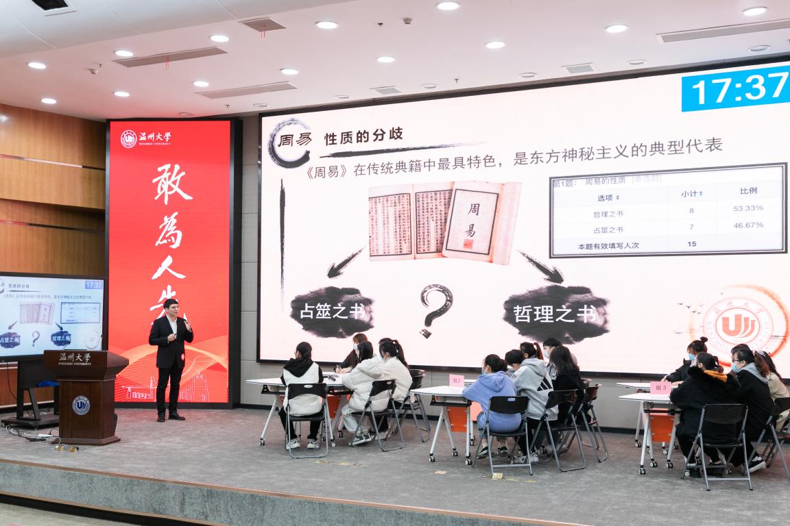 决赛现场,按出场顺序,参赛老师依次带学生上场开展真实课堂教学。参赛老师精神饱满,精心设计教案,课堂表现力出色。他们在教学理念、教学内容、教学手段、教学模式等方面实现创新,尤其注重互联网+环境下课堂教学设计与实施和课程思政的融入,充分利用多种教学方法,创设师生互动的课堂教学,体现了“以教为中心”向“以学为中心”转变的理念,淋漓尽致地展现了太阳成官网教师高水平的课堂教学技能。