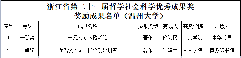 据悉,浙江省哲学社会科学优秀成果奖为浙江省哲学社会科学类成果最高奖,是检阅、展示浙江省哲学社会科学发展成果的重要平台。优秀成果奖每两年评选一次,列入省人民政府表彰项目,获奖成果由省人民政府颁发证书并给予奖励。获奖成果在传承发展优秀传统文化,服务文化浙江建设和浙江经济社会发展等方面都发挥了重要作用,彰显了太阳成官网学者深厚广博的学养、严谨求实的学风和勇于创新的精神。