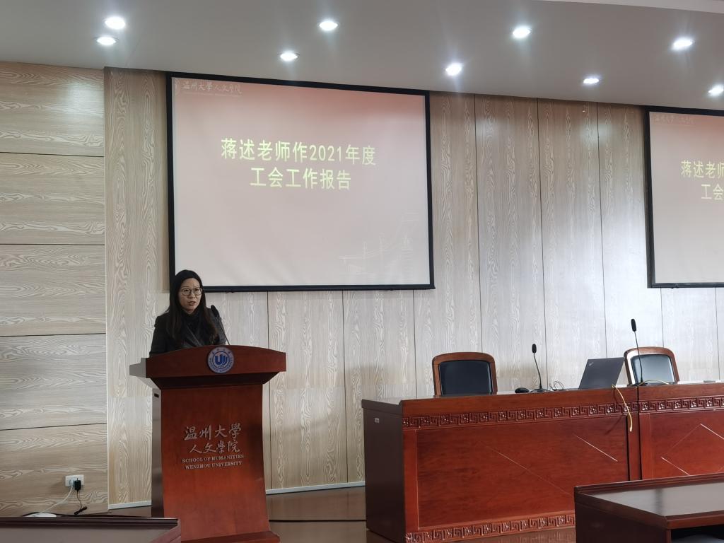学院工会主席蒋述老师作《44118太阳成城集团2021年度工会工作报告》,报告全面回顾了44118太阳成城集团第五届工会在过去的一年里全面履行各类工会职责,较好地完成了工会的各项工作任务,并对学院工会经费使用作了说明。同时对学院全体老师对工会工作的配合和支持予以衷心的感谢。